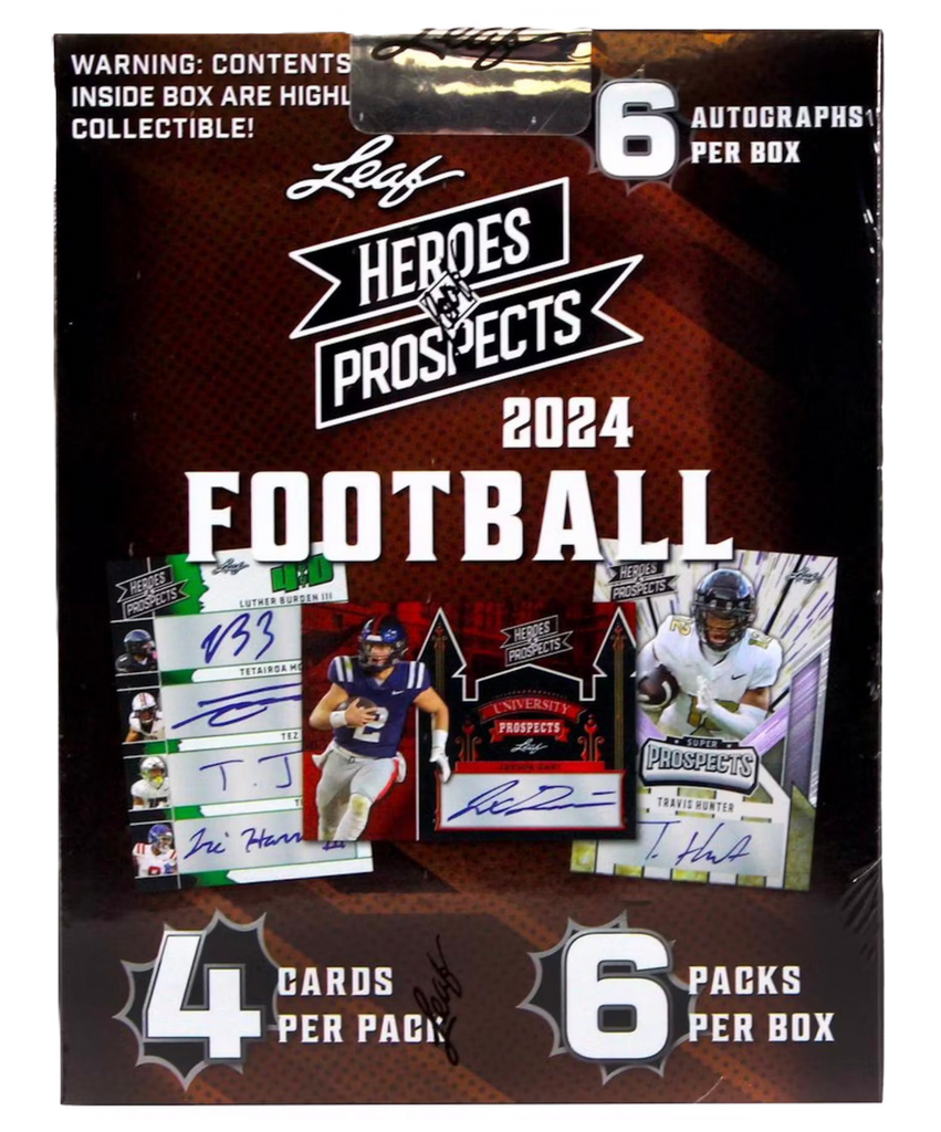 2024 Leaf Heroes & Prospects Football Hobby Box Every Box contains Six Autographs! Heroes and Prospects makes its Leaf debut! Each 2024 Leaf Heroes and Prospects Pack contains 3 Base/Parallel and 1…