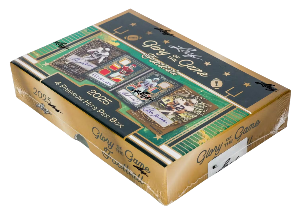 2025 Leaf Glory of the Game Football Hobby Box Every Box contains 4 Premium hits & at least Two Autograph Cards! Look for signatures of football legends and stars such as: Patrick Mahomes, Peyton M…