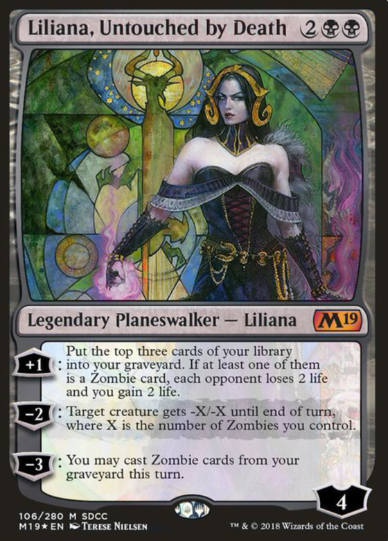 [+1]: Put the top three cards of your library into your graveyard. If at least one of them is a Zombie card, each opponent loses 2 life and you gain 2 life.[-2]: Target creature gets -X/-X until en…
