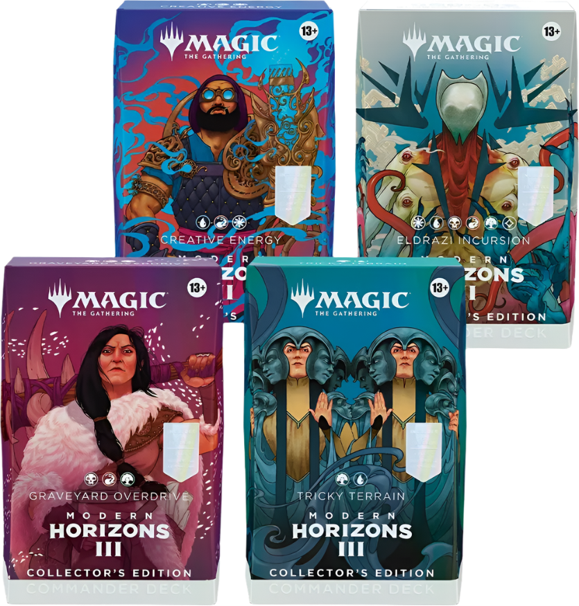 Modern Horizons 3 brings a heaping helping of exciting new cards to Modern, one of Magic’s most celebrated formats. Whether your players haven’t picked up a set in a while or are card-slinging veterans, there’s something for everyone to love.In Commander, four players come together to show their strength and strategy, with one player coming out on top. Each 100-card ready-to-play Modern Horizons 3 Commander Deck makes it easy for Commander fans in your store to grab a deck and play right away.With this special Collector’s Edition, every card has a brand-new foil treatment, and every deck contains two Borderless Profile cards. Get your players to elevate their Commander games to the ultimate tier and make every victory shine.Contents:• 1 ready-to-play deck of 100 Magic cards (2 Borderless Profile cards, 98 foil cards)• 2-card Collector Booster Sample Pack• 1 foil-etched Display Commander• 15 new-to-Magic cards• 10 double-sided tokens• 1 deck box (can hold 100 sleeved cards)• 1 Life Wheel• 1 strategy insert• 1 reference card