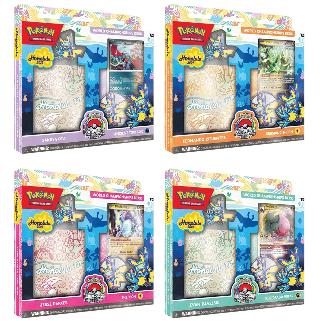 Grab a World Championships deck and play like a champion! Choose one of four powerful decks, each a card-for-card replica of an actual title-contender’s deck from the 2024 Pokémon Trading Card Game World Championships in Honolulu!