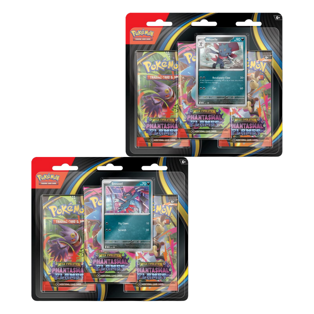 Ignite a Burning Spirit of Battle!Searing blue flames rip across a dark battlefield as Mega Charizard X ex soars up and looks down upon its opponents! With a deep chill to rival the heat, the shadowy figure of Mega Gengar ex slowly rises into view, and both Pokémon prepare to attack. Determined to prove their mettle, Mega Heracross ex, Mega Lopunny ex, and even more Pokémon line up to give it their all in the Pokémon TCG: Mega Evolution-Phantasmal Flames expansion!Each blister comes with 3 Phantasmal Flames booster packs and a promotional card of Sneasel or Weavile.